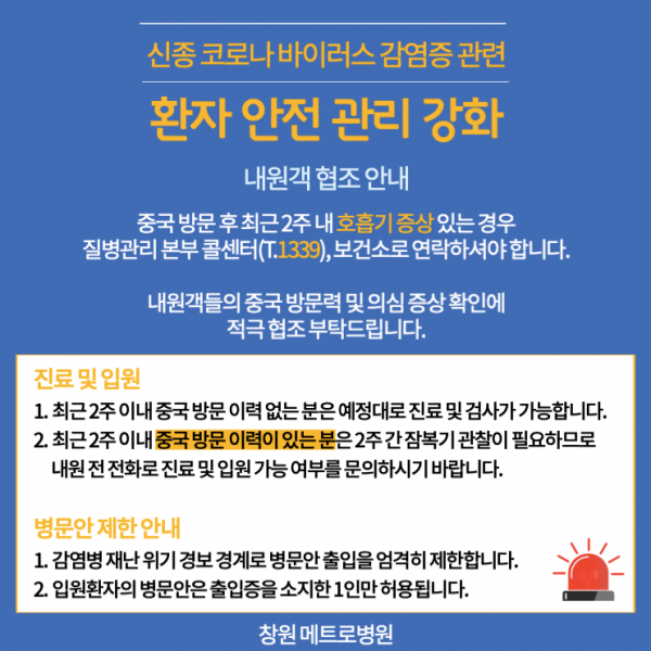최근 2주(14일) 이내 중국을 방문하신 분의 병원 출입은 제한합니다.