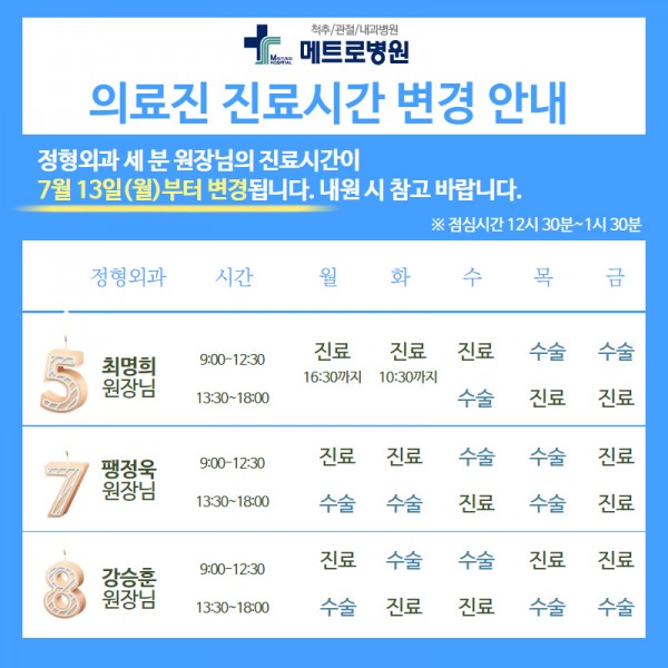 정형외과 최명희, 팽정욱, 강승훈 원장님 진료시간 변경 공지