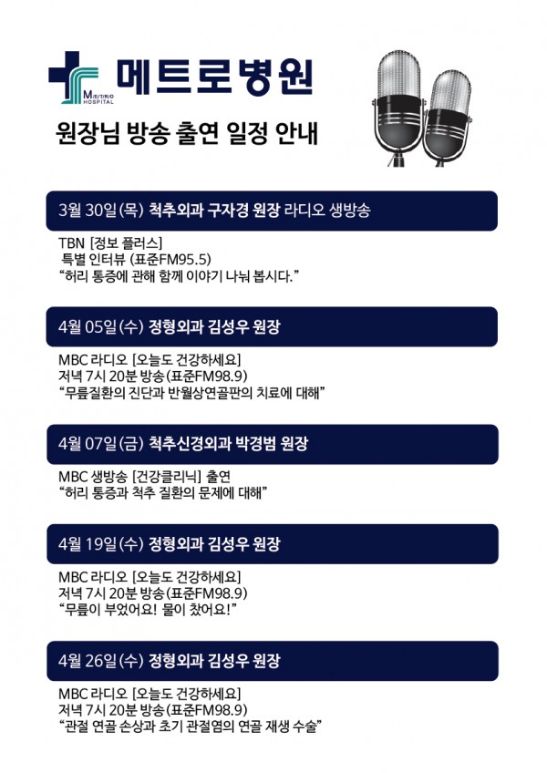 2017년 4월 메트로병원 의료진 방송 출연 일정 페이지 정보 작성자 게시판관리자 작성일 17-04-19 16:36 조회수 15,923회 관련링크 본문 메트로병원 원장님들의 방송 출연 일정을 안내 드립니다. 이전글 목록