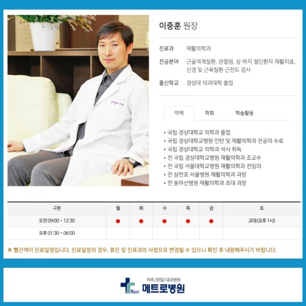 재활의학과 이중훈 원장님 외래진료 시간 09:00~12:30