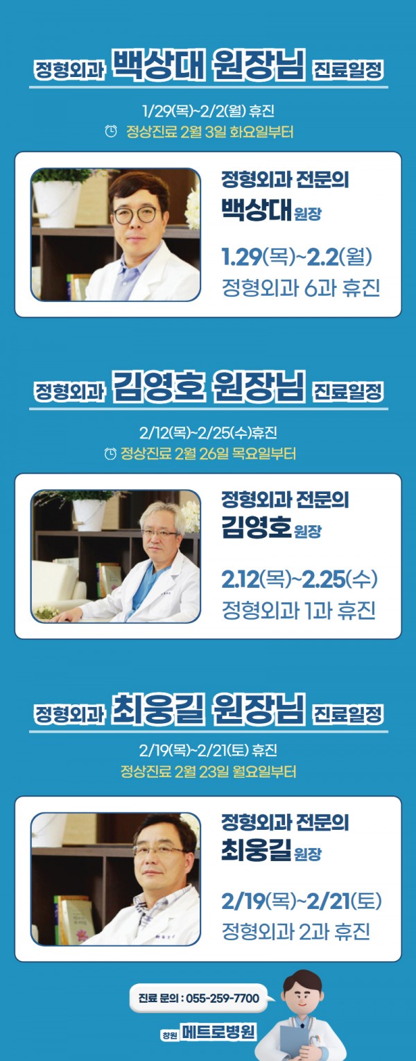 정형외과 세 분 원장님의 2월 휴진일이 확정되어 안내 드립니다.