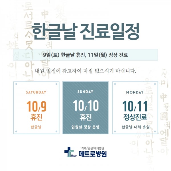 내원 일정에 참고 하여 차질 없으시기 바랍니다.