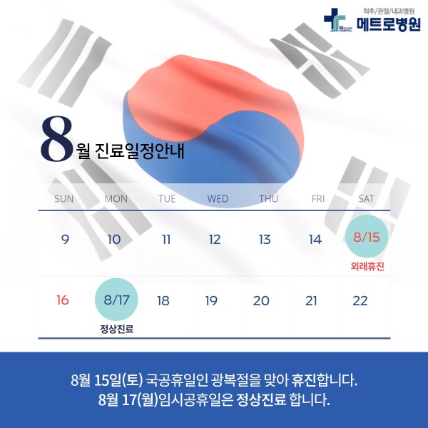 8월 15일 토요일은 국공휴일인 광복절을 맞아 외래진료 휴진합니다.