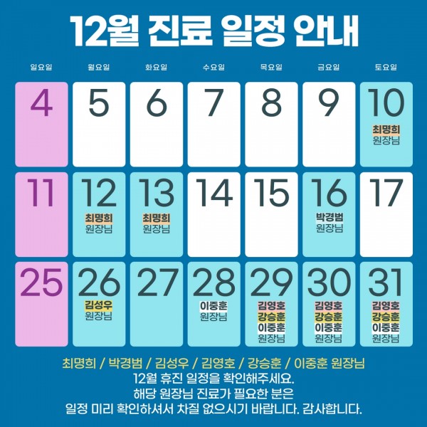 12월 중 본원 정형외과, 신경외과, 재활의학과 원장님들의