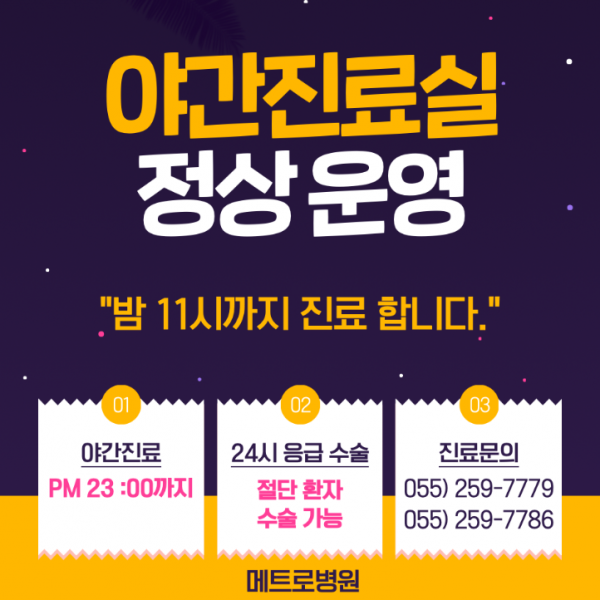 * 야간진료 종료 후 응급환자(절단 환자 ex. 수지접합수술) 수술 가능합니다.