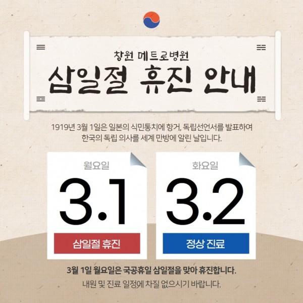 창원 메트로병원의 3월 1일 삼일절 휴진 안내 드립니다.