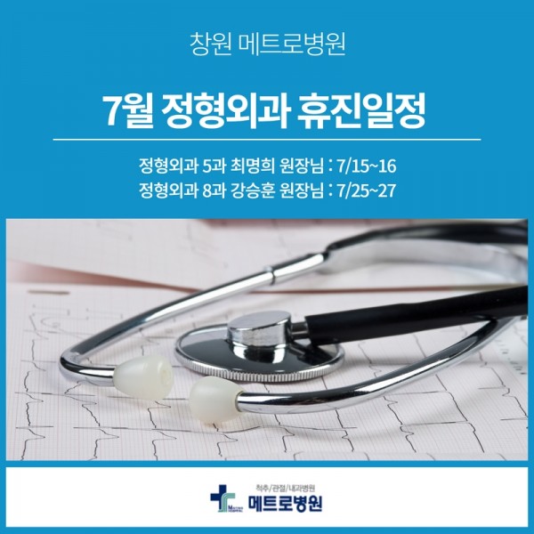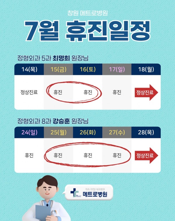 메트로병원 7월 최명희 원장님, 강승훈 원장님 휴진일 안내